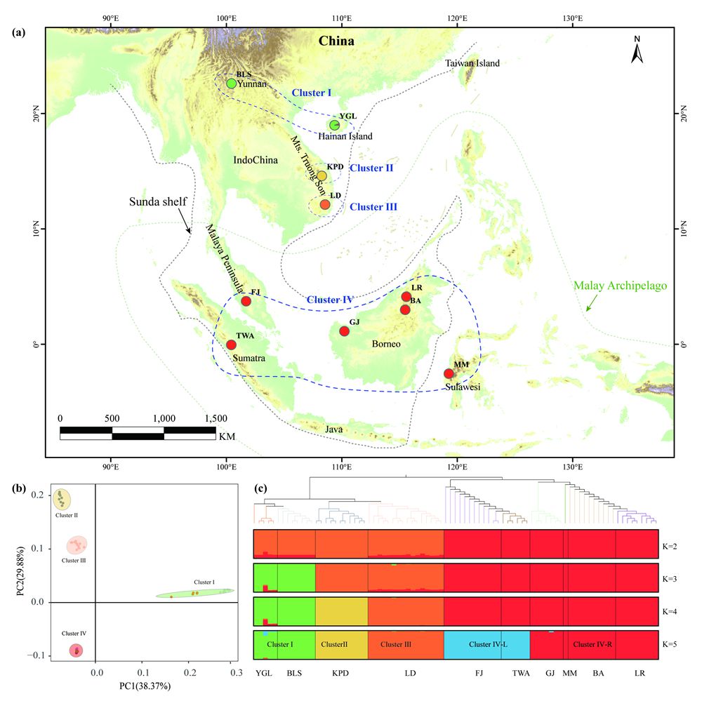 针对这一科学问题,中国科学院西双版纳热带植物园(以下简称“版纳植物园”)综合保护中心植物系统发育与多样性保护研究组的研究人员,以分布于东南亚各岛屿的轮叶三棱栎(Trigonobalanus verticillata)作为研究对象,整合RAD-seq基因组学数据与生态位模型,系统解析了该物种在中南半岛和马来群岛的时空分布格局、遗传多样性结构以及未来潜在分布动态。