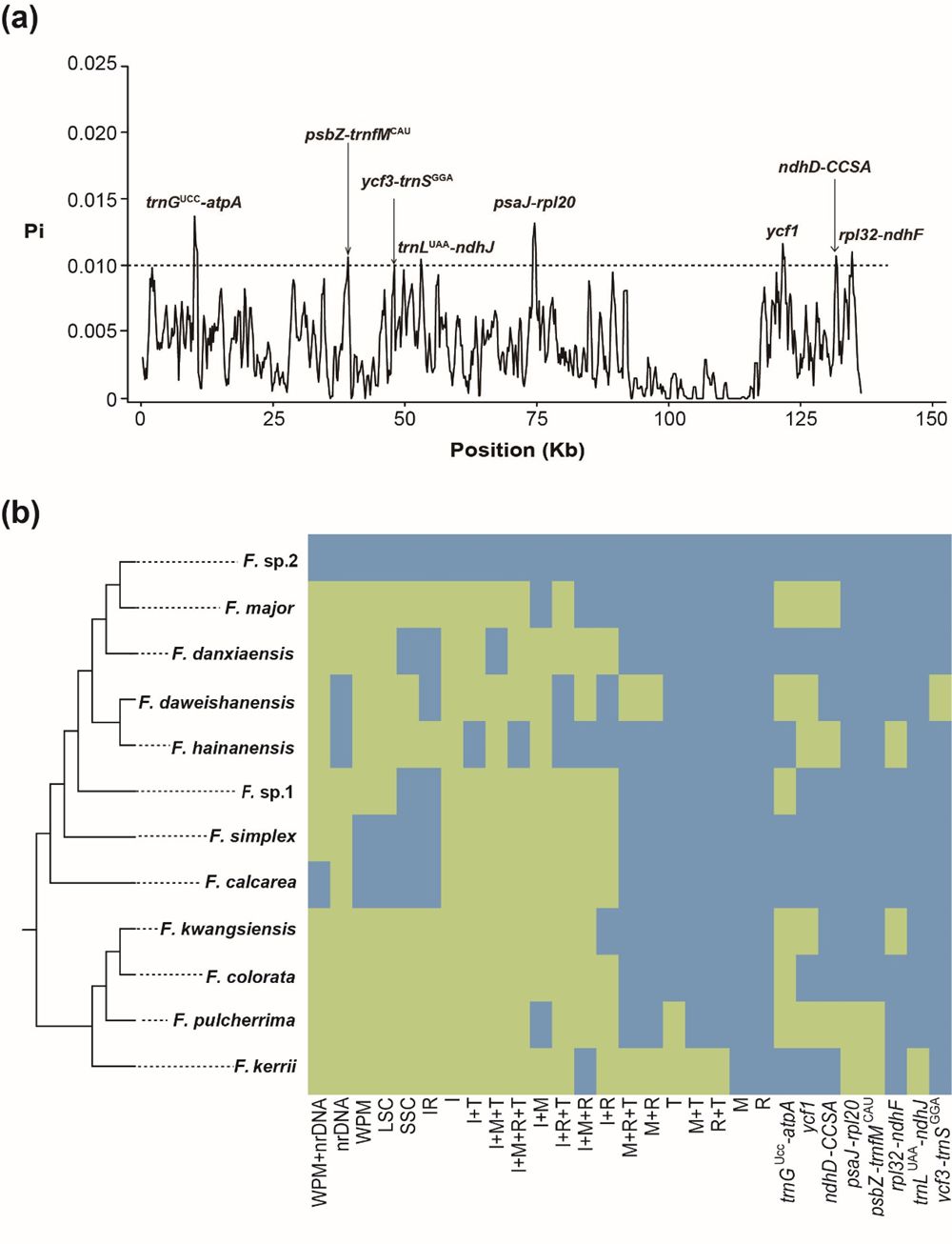 图 2.(a)基于叶绿体基因组核苷酸多态性识别出的八个高变区域;(b)采用最大似然法建树对上述高变区域与六个DNA超级条形码(WPM + nrDNA、nrDNA、WPM、LSC、SSC、IR)、四个植物DNA通用条形码(nrITS(I)、matK(M)、rbcL(R)、trnH-psbA(T))及其所有可能的组合进行物种鉴定效率比较。绿色代表鉴定成功,蓝色代表鉴定失败。