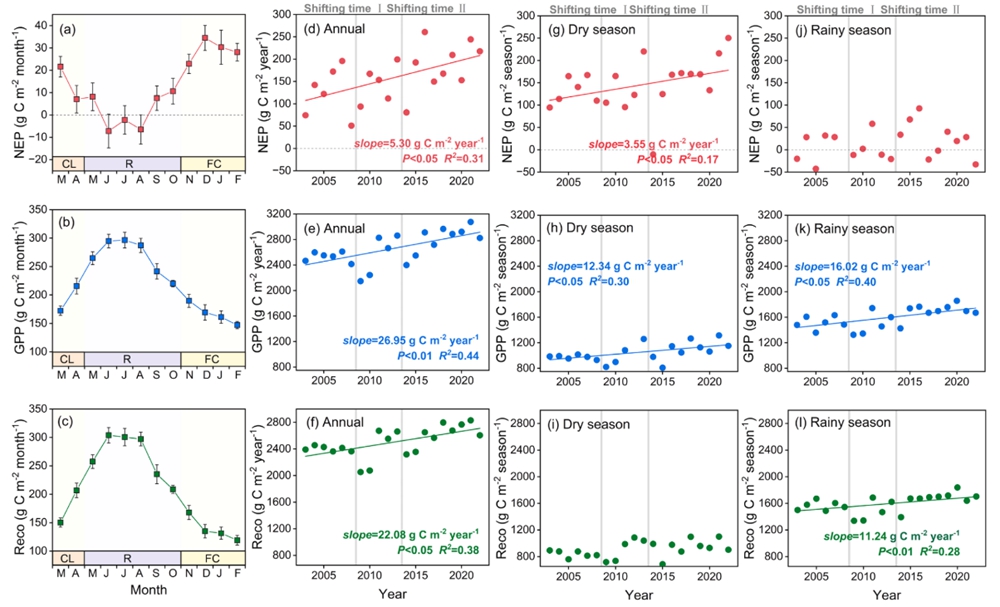中国科学院西双版纳热带植物园(以下简称“版纳植物园”)全球变化研究组基于涡度相关技术,对云南西双版纳热带季节性雨林开展了长达20年的碳通量观测研究。近期的研究通过分析整合长期的通量观测数据发现这片受保护的原始热带雨林在过去20年间持续扮演着稳定的碳汇角色,年均净生态系统生产力(NEP)达157.9 ± 56.7gC m-2,且碳汇能力呈现显著增强趋势,年增长率达3.4%。该研究为深入理解热带森林碳循环机制及其对气候变化的响应提供了宝贵的第一手数据。