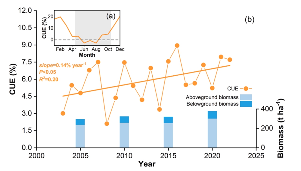 图2. 西双版纳热带季节雨林碳利用效率(CUE)。 (a) CUE的季节格局;(b) CUE和生物量的年际变化。CUE使用NEP/GPP计算。每5年的生物量数据由西双版纳热带雨林生态系统站(http://bnf.cern.ac.cn/)提供。灰色阴影表示雨季的持续时间。